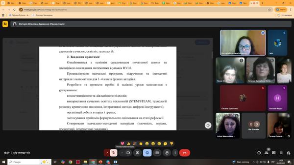 Керівник практики Прибора Т.О. ознайомила студентів із метою та завданнями практики, наголосила, що її основна мета полягає у формуванні загальних і спеціальних компетентностей майбутнього педагога початкової школи шляхом залучення до організації, проведення та аналізу освітнього процесу. Під час обговорення окремо акцентовано увагу на професійних якостях сучасного вчителя – педагогічній ініціативі, креативності, академічній доброчесності, умінні застосовувати інноваційні та інформаційно-комунікаційні технології у навчанні молодших школярів.