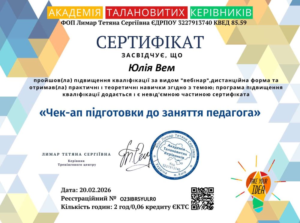 Студентка отримала корисні інструменти, які допоможуть структурувати процес підготовки, робити заняття більш ефективними та залученими. Вдячна «Академії талановитих керівників» за актуальний та лаконічний контент.