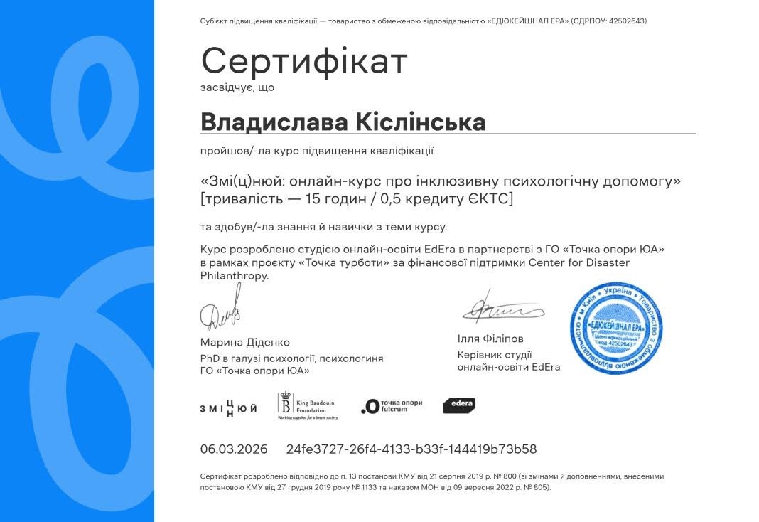 Пишаємося нашою студенткою 2 курсу спеціальності Спеціальна освітафакультету освітніх наук та мистецтв ЦДУ ім.В.Винниченка Владиславою Кіслінською, яка успішно завершила курс підвищення кваліфікації «Онлайн-курс про інклюзивну психологічну допомогу»!