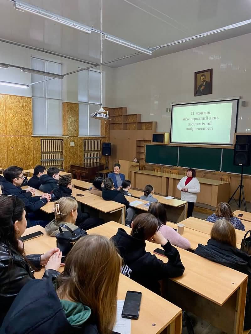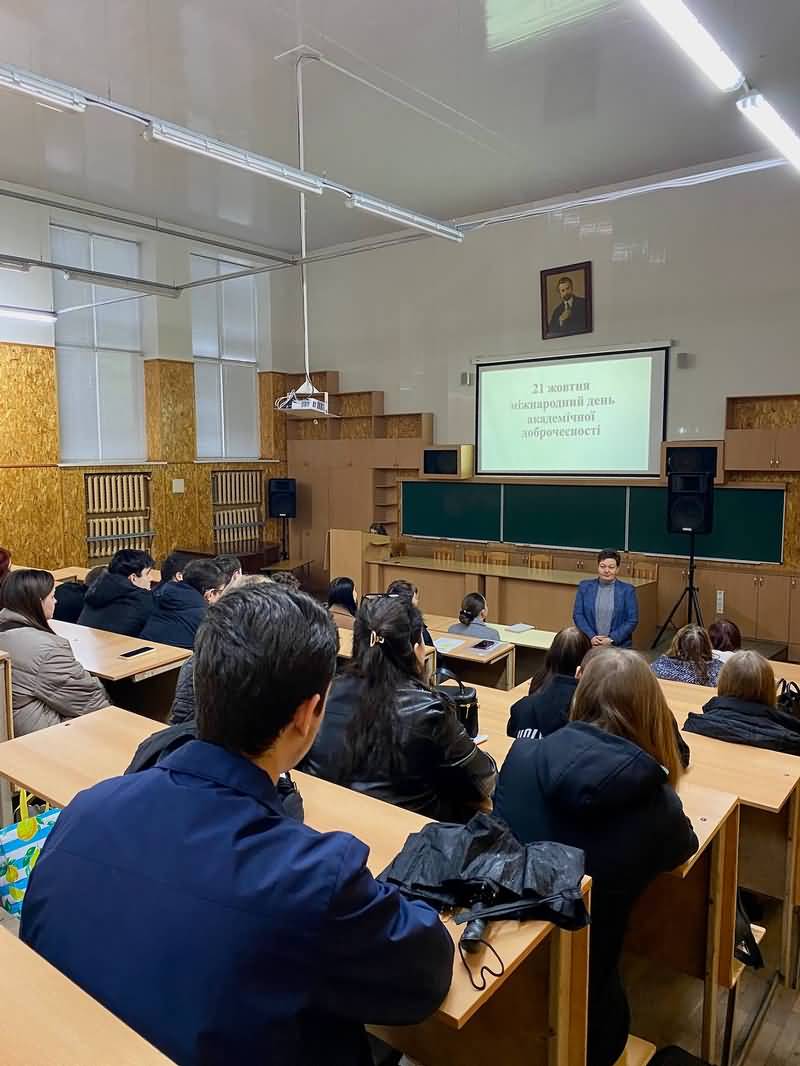 21 жовтня 2025 року Уповноважена особа з питань запобігання та протидії корупції, в.о. завідувача кафедрою галузевого права та правоохоронної діяльності ЦДУ ім. В. Винниченка Олена Окопник провела правопросвітницький захід присвячений міжнародному дню академічної доброчесності для студентів факультету права, бізнесу та адміністрування.
