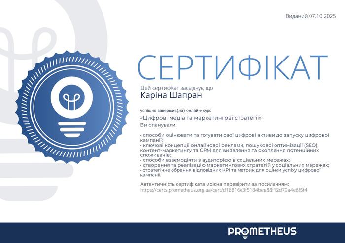 Здобувачі вищої освіти спеціальності «Менеджмент» - Бурдова Дар’я (гр. МЛ-23Б), Шапран Каріна (гр. МЛ-24Б2), а також студентка спеціальності «Комп’ютерні науки» - Снопік Єлизавета (гр. КН-23Б) кафедри менеджменту та підприємництва Центральноукраїнського державного університету імені Володимира Винниченка успішно пройшли онлайн-курс «Digital Media and Marketing Strategies» на платформі Prometheus у межах вибіркової дисципліни «Репутаційний менеджмент».