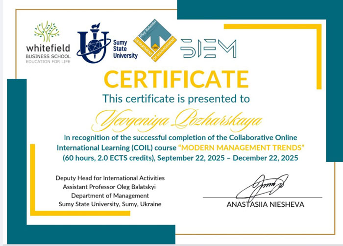 Висловлюємо щиру подяку координаторам спільного міжнародного COIL-курсу «Сучасні тенденції в менеджменті» за високий рівень організації, професійну підтримку та створення ефективного міжнародного освітнього середовища.