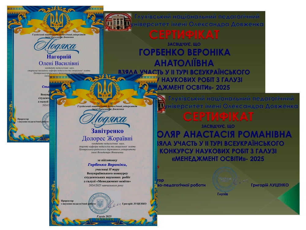 - Столяр Анастасія (СО 23Б). Участь у Всеукраїнському конкурсі наукових робіт з галузі «Менеджмент освіти» м. Глухів. Тема роботи «Соціально-психологічні аспекти управління інклюзивною освітою». 2025. Науковий керівник – к.п.н. Нагорна О. В.