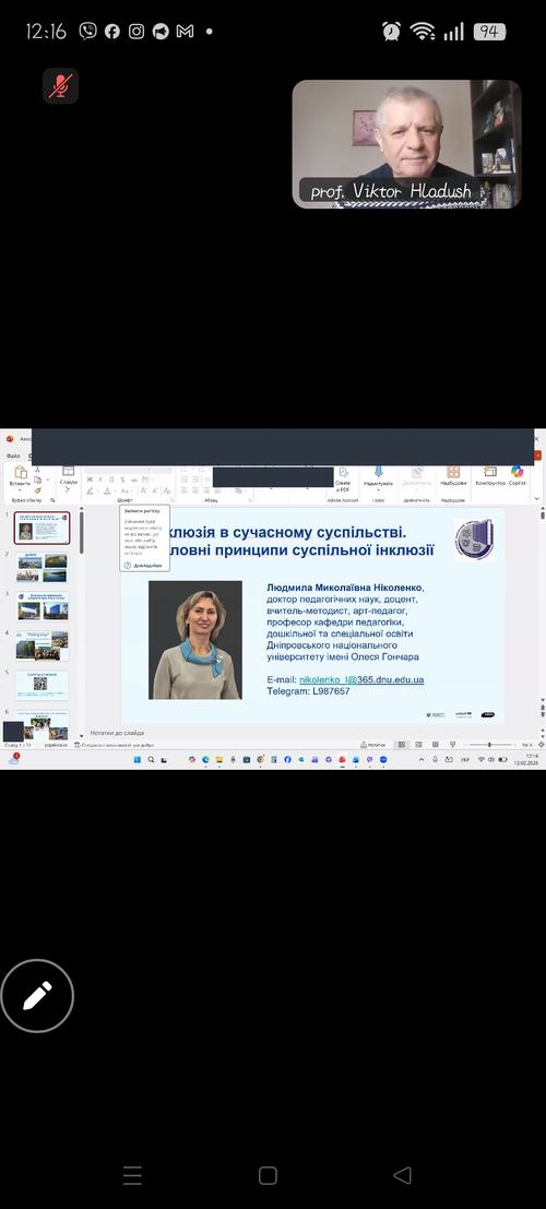 12 лютого 2026 року викладачі кафедри спеціальної освіти факультету освітніх наук та мистецтв Центральноукраїнського державного університету імені Володимира Винниченка взяли участь у гостьовій лекції доктора педагогічних наук, професора кафедри педагогіки, дошкільної та спеціальної освіти Дніпровського національного університету на тему: «Інклюзія в сучасному суспільстві. Головні принципи суспільної інклюзії».
