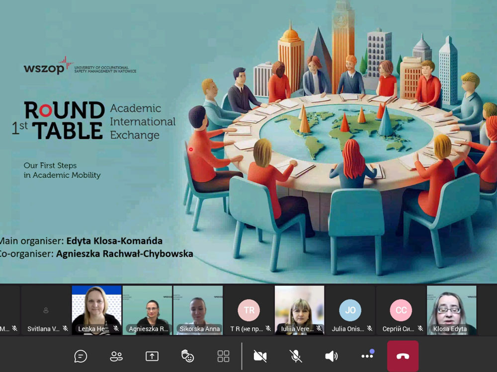 22 жовтня 2025 року відбувся перший круглий стіл «Міжнародний академічний обмін», організований Університетом управління охороною праці в Катовіцах (WSZOP, Польща). Захід об’єднав представників українських та європейських закладів вищої освіти, які обговорили актуальні питання розвитку академічної мобільності та міжнародних освітніх проєктів.