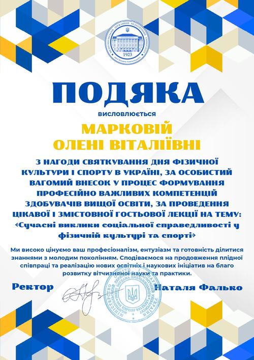 10 вересня 2025 р. в онлайн-залі МДПУ ім. Б. Хмельницького відбулася лекція від Олени Маркової - в.о. декана факультету спорту та фізичної культури ЦДУ ім. В. Винниченка, кандидата педагогічних наук, доцента кафедри фізичної культури та медико-біологічних дисциплін, гаранта програми «Середня освіта (Фізична культура)».