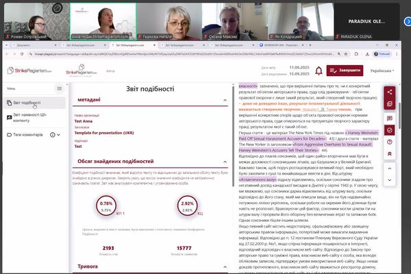 Учасники заходу мали змогу ознайомитися з новими функціональними можливостями системи StrikePlagiarism.com, зокрема зручним коментуванням у звіті подібності, використанням шаблонів у вигляді тегів та створенням особистої бібліотеки коментарів. Окрема увага була приділена питанням виявлення текстів, згенерованих штучним інтелектом, принципам роботи механізму розпізнавання та інтерпретації результатів.