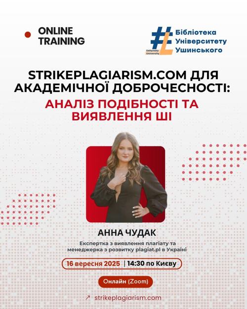16 вересня 2025 року студенти групи ЦТ24М — Островський Роман та Тарас Шевченко — взяли участь у онлайн-тренінгу «StrikePlagiarism.com для академічної доброчесності: аналіз подібності та виявлення ШІ», організованому компанією StrikePlagiarism.com спільно з Бібліотекою Університету Ушинського.
