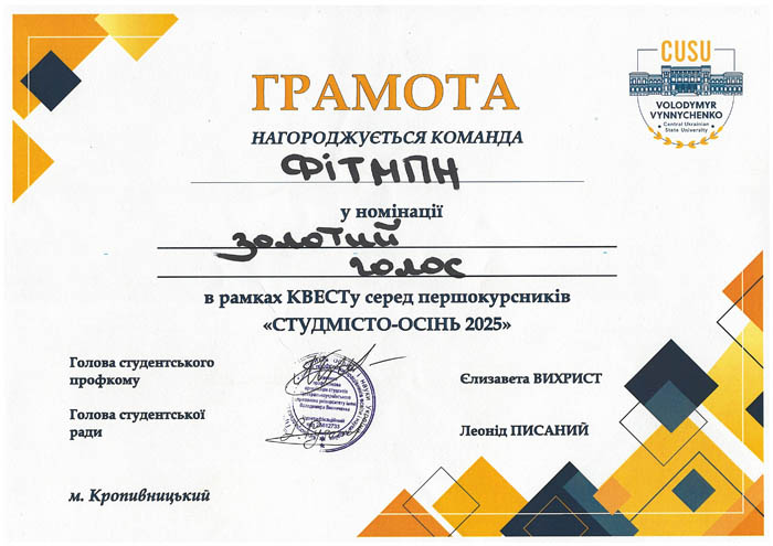 А на завершення — конкурс талантів, де студенти факультету вразили всіх глядачів своїм вокальним виступом. У їхньому виконанні прозвучала пісня "Козацькому роду нема переводу" — щира, потужна, сповнена національного духу. Цей номер став справжнім гімном єдності та гордості за українське коріння. За емоційність і вокальну майстерність наші студенти отримали почесну номінацію "Золотий голос" — заслужено і гучно!