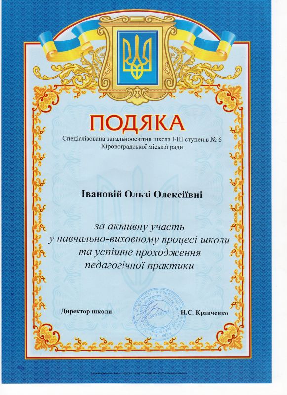 Загалом практика пройшла успішно. Свідченням цього є подяка видана керівництвом школи, а також, і найголовніше, подяка від учнів.