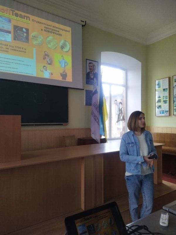 За ініціативи сектору міжнародної діяльності, в особі помічника ректора з міжнародної діяльності Філоненко Оксани Володимирівни, 26 квітня 2023 року об 11:40 в аудиторії 52 (2-поверховий корпус) відбулася презентація проєктів для студентів у Німеччині з представниками компанії «Profiteam»: для ознайомлення з умовами працевлаштування, термінами роботи, актуальними вакансіями тощо.