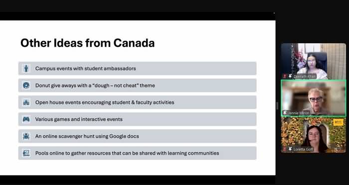 - Дженні Мірон (Канада) поділилася досвідом організації заходів у Торонто. Серед них – AI prompt battle, студентські інтерактивні столи з інформаційними матеріалами, креативні акції на кшталт «Donut Cheat Day», що у невимушеній атмосфері нагадують молоді про цінність доброчесності.