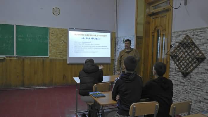 Андрій поділився власним досвідом навчання в університеті, розповів про цікаві дисципліни, можливості розвитку особистості, участь у конференціях, конкурсах та творчих проєктах. Учні активно ставили запитання — їх цікавили умови вступу, особливості навчання на різних спеціальностях, а також життя студентів поза навчанням.