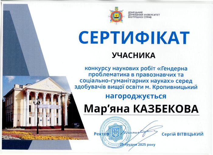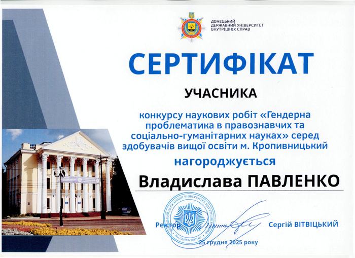 На кафедрі менеджменту та підприємництва вручили сертифікати Казбековій Мар’яні та Павленко Владиславі за участь у фінальному етапі міського конкурсу наукових робіт «Гендерна проблематика в правознавчих та соціально-гуманітарних науках», який проходив у грудні 2025 року на базі Донецького державного університету внутрішніх справ. Юних науковиць привітали в.о. завідувача кафедри менеджменту та підприємництва, професор Олександр Левченко, наукова керівниця, доцентка Людмила Яременко та інші викладачі кафедри.