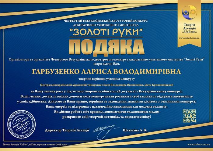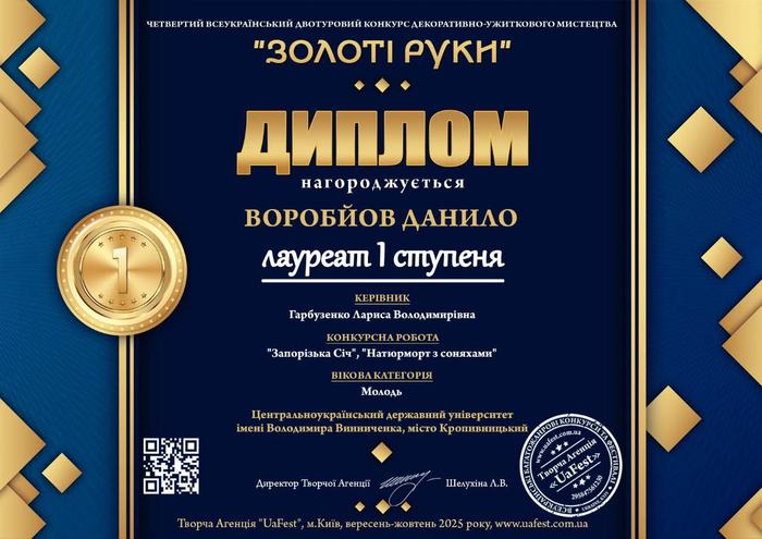Студент Центральноукраїнського державного університету імені Володимира Винниченка факультету освітніх наук та мистецтв, Спеціальність: 023 Образотворче мистецтво, декоративне мистецтво, реставрація Воробйов Данило здобув диплом лауреата І ступеня у IV Всеукраїнському двотуровому конкурсі декоративно-ужиткового мистецтва «Золоті руки».