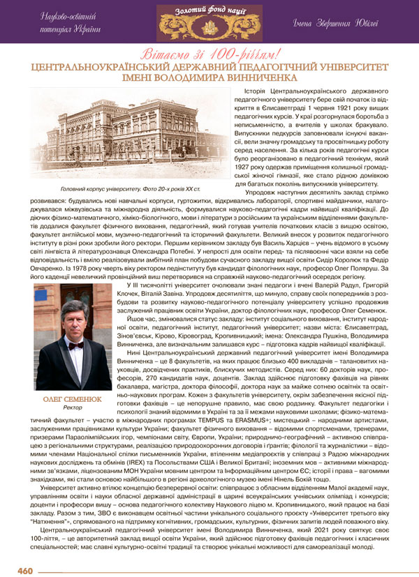 У книзі представлені біографії знаних і шанованих особистостей та історії провідних підприємств і організацій – ювілярів 2020 та 2021 років. Інформація про історію становлення, сучасний стан і роль у розвитку освітньої галузі країни Центральноукраїнського державного педагогічного університету імені Володимира Винниченка представлена в розділі «Наука і освіта».