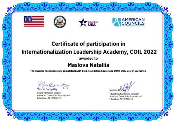 У грудні 2021 року пані Наталя увійшла до двадцятки учасників програми Education USA “Академія лідерства з інтернаціоналізації” та пройшла курси COIL Foundation Workshop та COIL Design Workshop, які проводилися центром Державного університету штату Нью-Йорк (SUNY COIL Center) та мали на меті підготовку українських та американських партнерів до створення модулів віртуального обміну студентів.