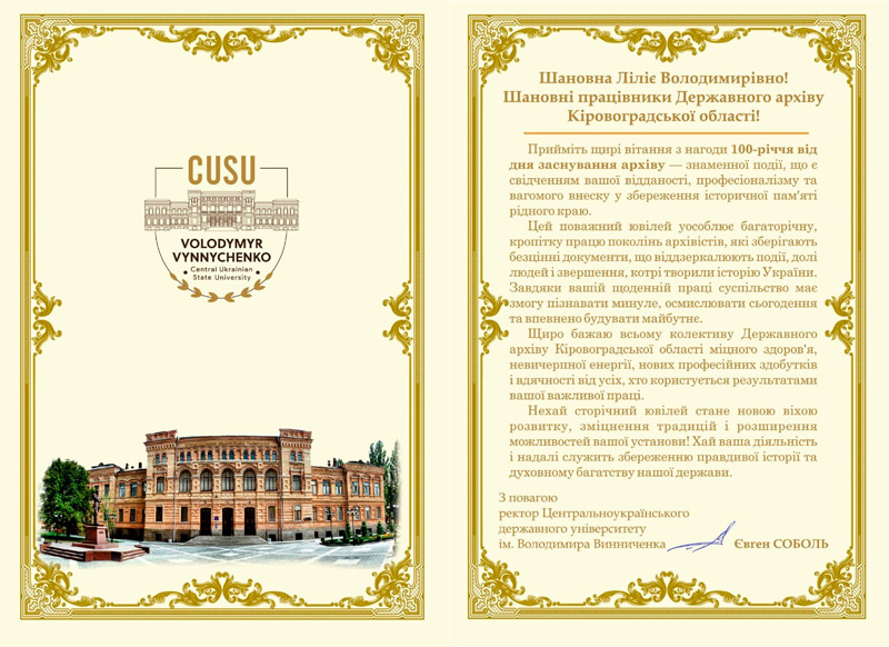 19 листопада 2025 року Державний архів Кіровоградської області відзначає 100-річчя від дня заснування. Колектив Центральноукраїнського державного університету імені Володимира Вининиченка щиро вітає з ювілейною датою установи, щоденний внесок працівників якої є важливою опорою для науки, освіти та всієї громади нашого регіону.