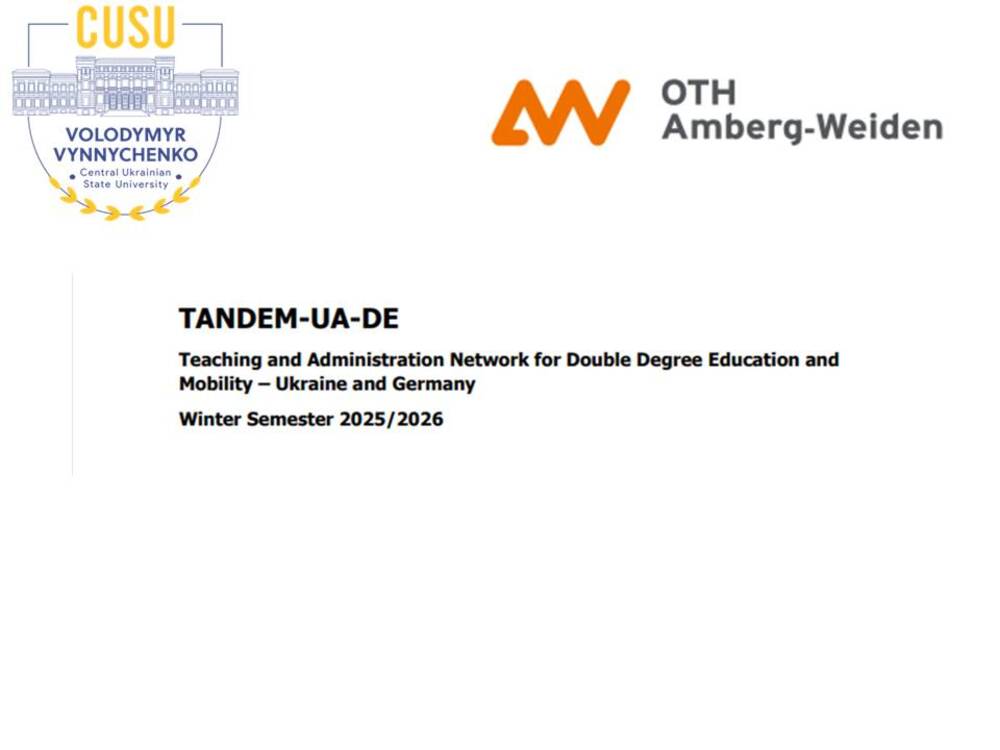 У межах проєкту TANDEM-UA-DE (Мережа викладання та адміністрування для подвійного дипломування та мобільності – Україна та Німеччина), ініційованого Східнобаварським університетом прикладних наук Амберг-Вайден (OTH Amberg-Weiden) та реалізованого за підтримки DAAD у рамках програми «Німецько-українська університетська мережа», студенти Центральноукраїнського державного університету імені Володимира Винниченка були відібрані для участі в програмі академічної мобільності.