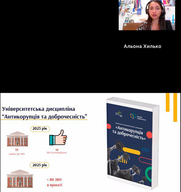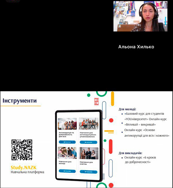 Модератором зустрічі була Альона Хилько, заступниця керівника управління та керівниця відділу просвітницької роботи Управління просвітницької роботи та навчальних програм Офісу доброчесності НАЗК.