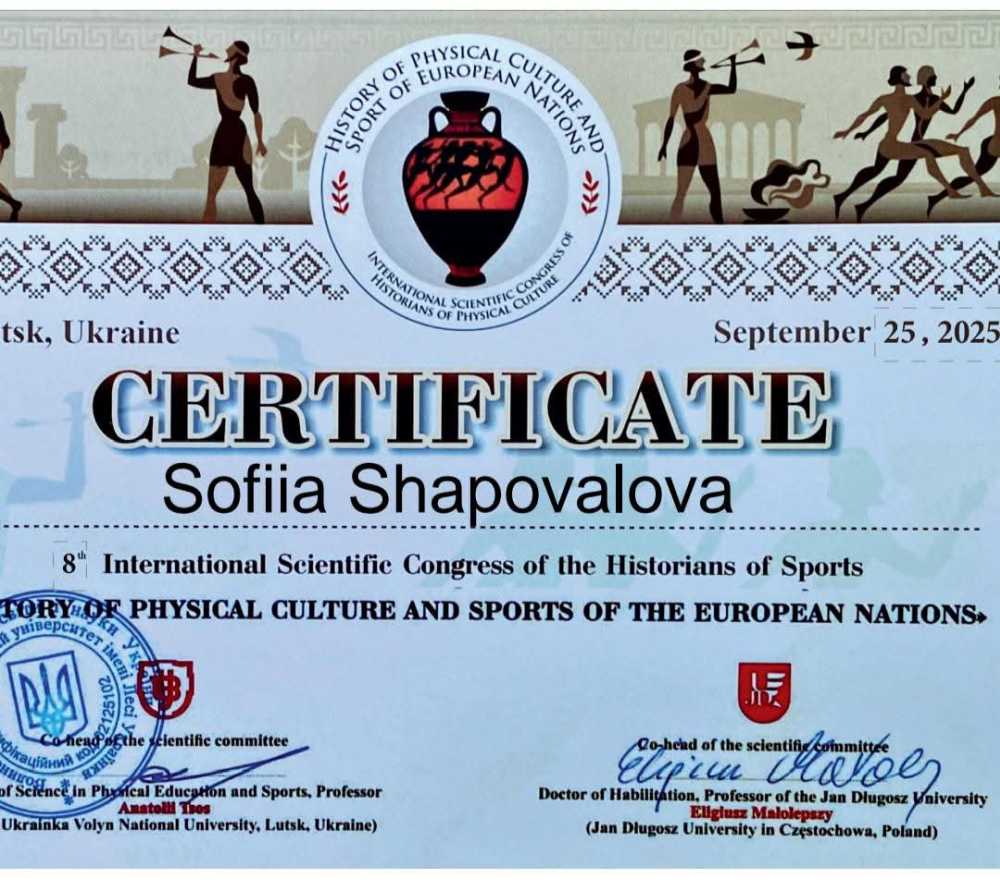 Шаповалова Софія здобувачка вищої освіти магістерського рівня спеціальності А7 Фізична культура і спорт разом з науковим керівником Маленюк Тетяною прийняли участь у VIII Міжнародному науковому конгресі істориків фізичної культури "Історія фізичної культури і спорту народів Європи".
