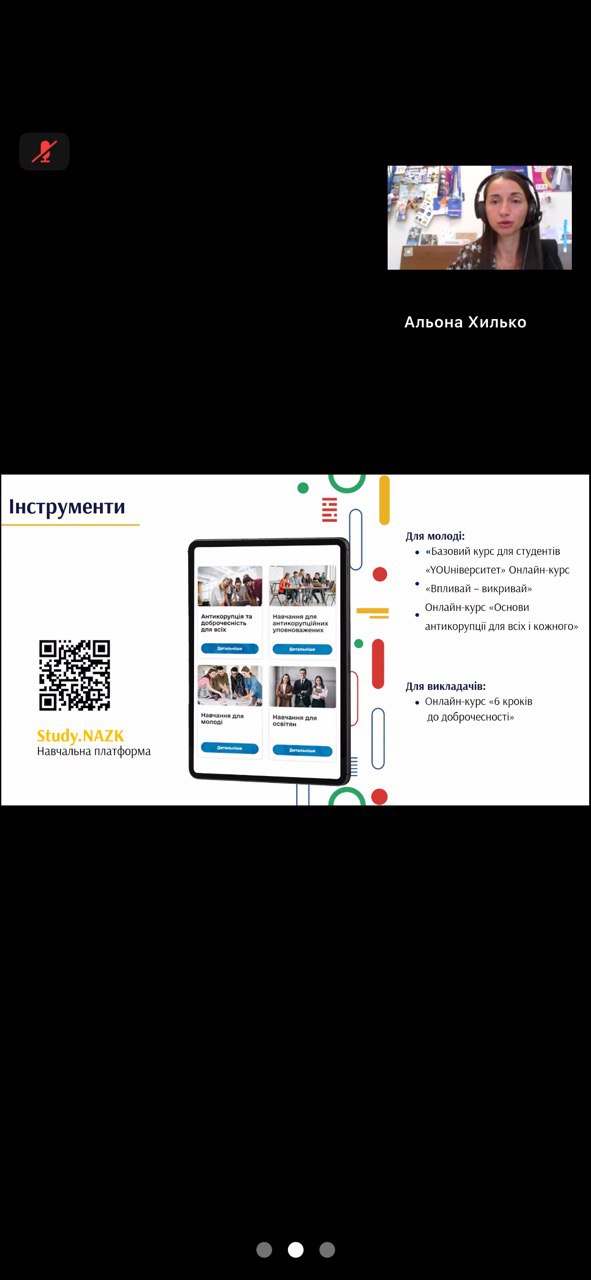 Модератором зустрічі була Альона Хилько заступниця керівника управління – керівник відділу просвітницької роботи Управління просвітницької роботи та навчальних програм Офісу доброчесності Національного агентства з питань запобігання корупції.