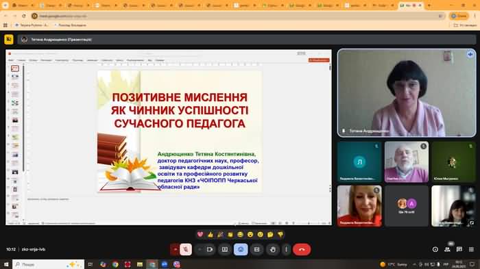 Доктор педагогічних наук, професор, завідувач кафедри дошкільної освіти та професійного розвитку педагогів КНЗ «ЧОІПОПП Черкаської обласної ради» Андрющенко Тетяна Костянтинівна у своєму виступі висвітлила значення позитивного мислення як важливого чинника професійної успішності сучасного педагога. Вона наголосила, що свідома установка на позитив, уміння відмовлятися від негативних формулювань та замінювати їх конструктивними висловлюваннями створюють основу для внутрішньої гармонії, стресостійкості та віри у власні можливості. Науковиця детально зупинилася на техніках і вправах, що допомагають педагогу підтримувати позитивний настрій, зокрема техніці «звільнення від частки не», методиці «шкідливих слів», пошуку позитиву в негативі, а також практиці роботи з емоціями «7-П». Вона підкреслила, що позитивне мислення тісно пов’язане з формуванням професійної самосвідомості педагога та визначає стиль його спілкування з дітьми і колегами. Педагог, який свідомо розвиває в собі цю здатність, здатний передавати вихованцям установку на оптимізм, життєву активність та самореалізацію, що відповідає гуманістичним орієнтирам сучасної освіти.