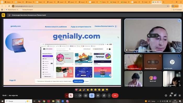 Окремо було розглянуто можливості платформи Genially.com, яка пропонує велику кількість шаблонів, серед яких значна частина доступна безкоштовно. Водночас Шикиринська Олександра Василівна зауважила, що цей ресурс не має української мовної підтримки, обмежуючись лише чотирма мовами, серед яких англійська.