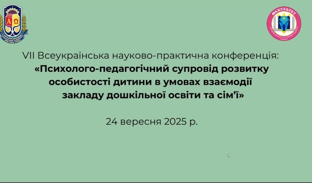 24 вересня 2025 року викладачі кафедри дошкільної та початкової освіти (Котелянець Н. В., Котелянець Ю. С., Нікітіна О. О., Мартін А. М., Горська О. О., Баранюк І. Г., Андросова Н. М., Вдовенко В. В., Жигова І. В., Кіндей Л. Г., Цуканов Н. М., Прибора Т. О.) та студенти спеціальності А2 «Дошкільна освіта» бакалаврського рівня (група ДО23-Б) і магістерського рівня (група ДО25-М) взяли участь у VІІ Всеукраїнській науково-практичній конференції «Психолого-педагогічний супровід розвитку особистості дитини в умовах взаємодії закладу дошкільної освіти та сім’ї».