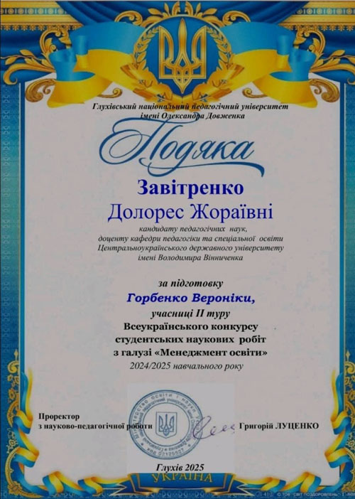 Студентки спеціальності Спеціальна освіта ЦДУ ім.В.Винниченка факультету педагогіки, психології та мистецтв взяли участь у Всеукраїнському конкурсі наукових робіт з галузі "Менеджмент в освіті" - 2025.