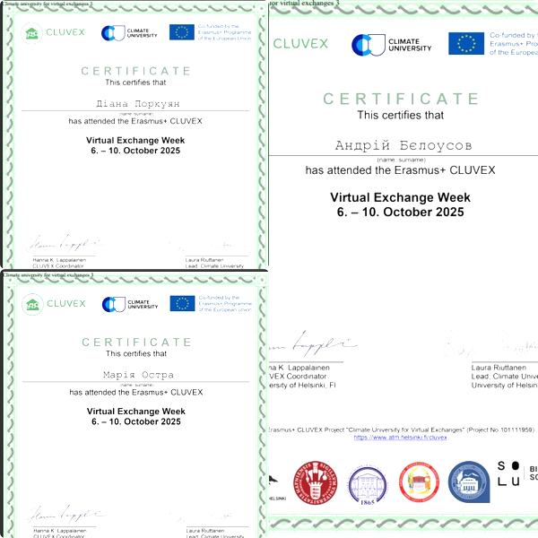 З 6 по 10 жовтня 2025 року відбувся третій тиждень віртуальних обмінів у межах проєкту CLUVEX Європейської програми Erasmus+. Це мультидисциплінарний міжнародний онлайн-тиждень студентських обмінів, до якого долучилися понад 300 студентів з Данії, України, Вірменії, Фінляндії та інших країн Європи та Східного партнерства.