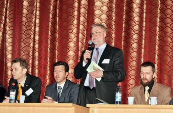 Після привітального слова ректора Університету, професора Олега Анатолійовича Семенюка, перед усіма учасниками конференції виступили поважні гості з України та закордону (в алфавітному порядку): доктор філософії Колін Брок, професор Оксфордського університету (Велика Британія), професор, доктор філологічних наук Світлана Денисова, завідувач кафедри зіставного мовознавства і теорії та практики перекладу Київського національного лінгвістичного університету, професор, доктор філологічних наук Тарас Кияк, почесний президент Української спілки германістів вищої школи України, завідувач кафедри теорії та практики перекладу з німецької мови (КНУ ім. Тараса Шевченка), доктор філософії Марія Куса, професор кафедри російської мови і літератури Братиславського університету імені Яна Амоса Коменського (Словаччина), Флоріан Кюхлер, керівник інформаційного центру Німецької служби академічних обмінів (DAAD) в Україні (Київ), доктор філологічних наук, професор Анатолій Мойсієнко, завідувач кафедри сучасної української мови (КНУ ім. Тараса Шевченка), доктор філософії, поет перекладач Андрій Савенець (Лодзь – Люблін, Польща), Керол Хеддевей, старший науковий співробітник (Держдепартамент США), доктор педагогічних наук Леонід Черноватий, професор кафедри теорії та практики перекладу з англійської мови (ХНУ ім. В. Н. Каразіна).