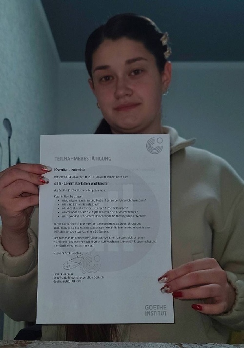 Студентки ІІ курсу освітньої програми «Мова і література (англійська, німецька)» отримали сертифікати від Goethe-Institut Ukraine, які засвідчують що вони успішно пройшли навчальний курс «DLL 5: Lernmaterialien und Medien» на платформі Гете-Інституту. Цей курс імплементований в освітню програму підготовки магістрів у межах кооперації ЦДУ імені Володимира Винниченка з Goethe-Institut Ukraine та дає можливість здобувачам освіти вивчати сучасні методичні підходи до навчання іноземних мов відповідно до європейських стандартів.
