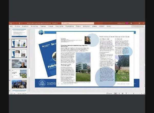 Модераторка Інна Бариш розповіла про всі види програм, які включають здобуття магістерського ступеня, стажування з викладання української мови і культури, а також проведення досліджень в університетах США. До бесіди також приєдналася Енні Джоконді, яку свого часу мав честь приймати наш університет. Відбулася дуже тепла та цікава розмова. Енні ще раз наголосила на важливості міжнародних обмінів, адже вони впливають не лише на академічні досягнення, а й на життєвий досвід, який є надзвичайно цінним.