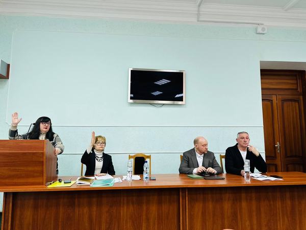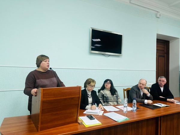 В обговоренні звіту голови профкому О. О. Горської про роботу профспілкового комітету університету за 2025 р. узяли участь ректор університету професор Є. Ю. Соболь, головний бухгалтер Ю. Ю. Суслова, голова Ради ветеранів університету професор А. Б. Рацул, запрошений голова обкому Профспілки С. Ю. Петров.
