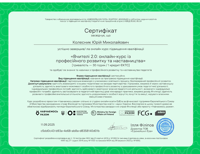 Також в межах вибіркового курсу «Технології та стратегії сталого розвитку» (проф. Садовий М.І.) успішно пройшов курси неформальної освіти здобувач спеціальності A4.09 «Середня освіта (Інформатика) Максим Остапчук. Він отримав сертифікацію із базового курсу «Основи кібергігієни», «Інформаційна безпека» і успішно пройшов тестування «Цифрограм 2.0 для громадян» на національній онлайн платформі Дія. Освіта.