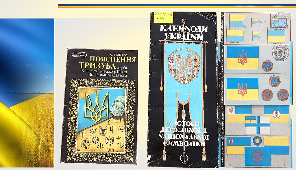 Перша рубрика виставки “Державні символи України” висвітлює матеріали про державні символи: Державний прапор України, Державний герб України і Державний гімн України а також пояснення та походження символів, покладених в основу цих ознак державної незалежності.