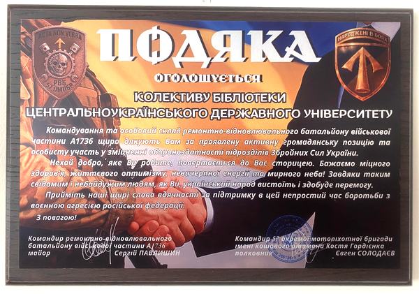 Співробітники Бібліотеки ЦДУ імені Володимира Винниченка отримали подяку від командування військової частини А1736 за проявлену активну громадянську позицію та особисту участь у зміцненні обороноздатності підрозділів Збройних Сил України.