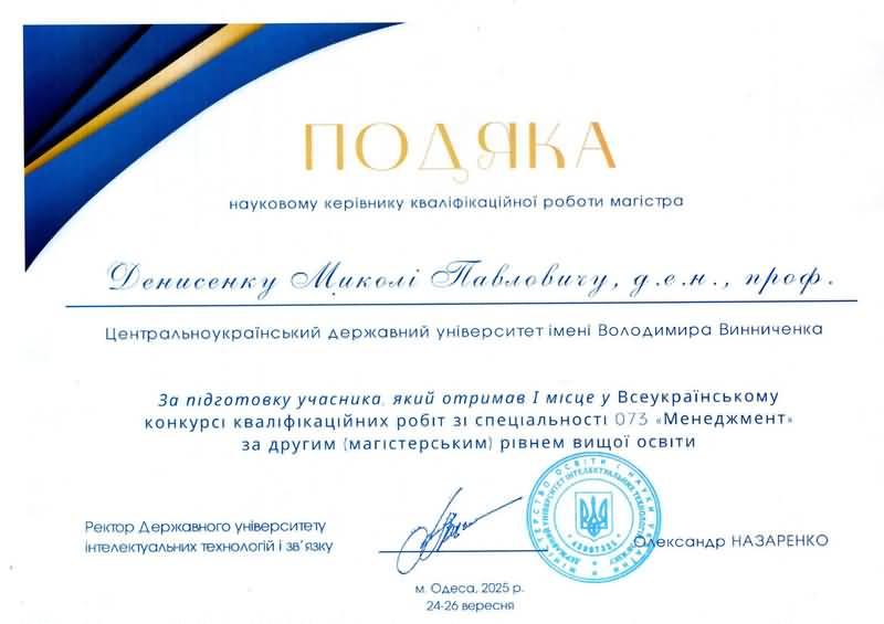 Подяку за підготовку учасника, який посів І місце отримав Денисенко Микола Павлович, д.е.н., професор кафедри менеджменту та підприємництва ЦДУ імені В. Винниченка.