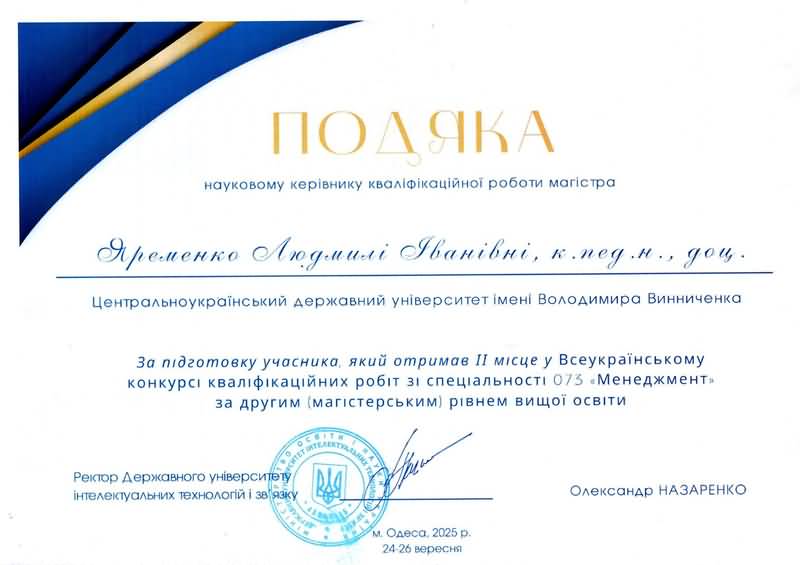 Подяку за підготовку учасника, яка посіла ІІ місце отримала Яременко Людмила Іванівна, к.пед.н., доцент кафедри менеджменту та підприємництва ЦДУ імені В. Винниченка.