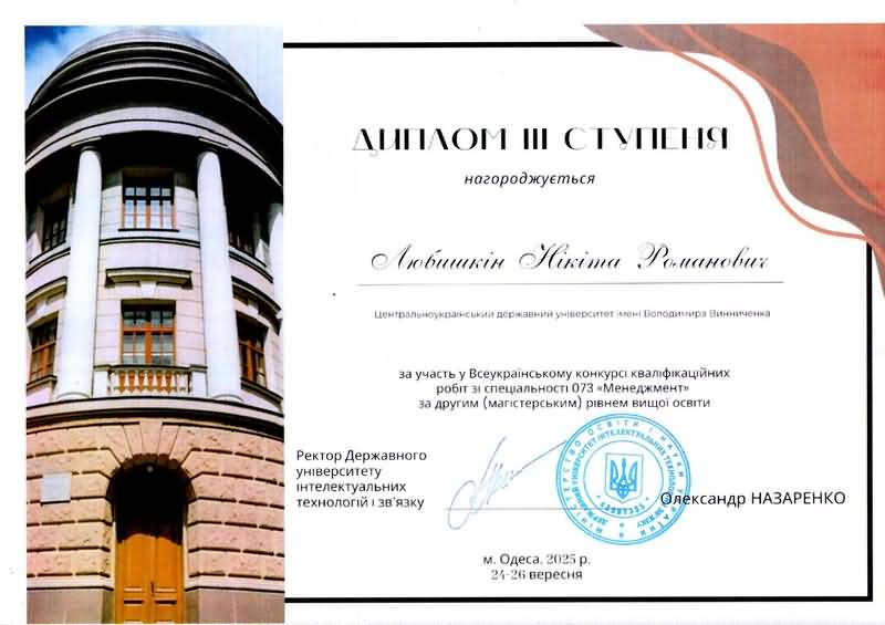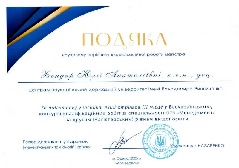 У вересні 2025 року на базі Державного університету інтелектуальних технологій і зв’язку (м. Одеса) відбувся Всеукраїнський конкурс кваліфікаційних робіт зі спеціальності 073 «Менеджмент» за другим (магістерським) рівнем вищої освіти.