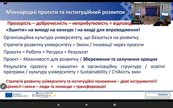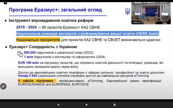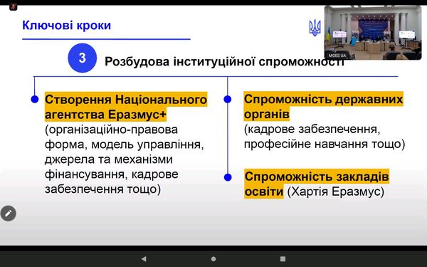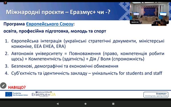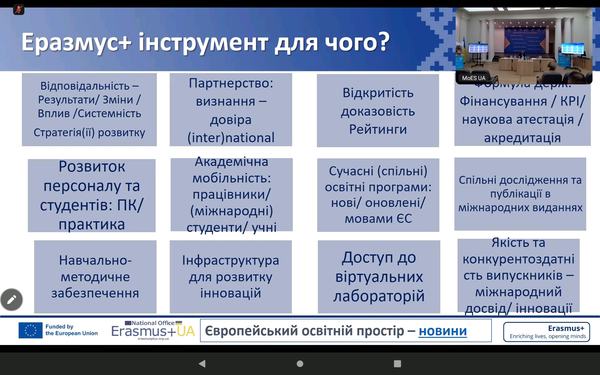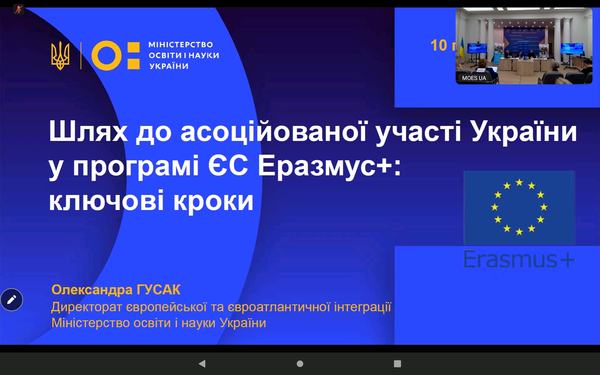 - Шляхи до асоційованої участі України в програмі «Еразмус+» — експерти презентували основні кроки, необхідні для повноцінного включення України як асоційованої країни-учасниці програми, що відкриє ще більше можливостей для університетів, студентів та працівників освіти.