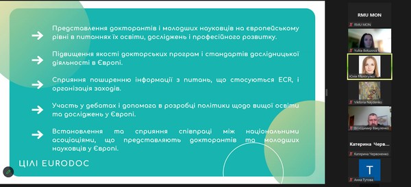Спікер Юлія Малогулко детально розказала про організацію Eurodoc, її місію та візію, напрями діяльності, проєкти, робочі групи. Важливим аспектом доповіді було питання можливості комунікації та долучення до цієї міжнародної організації.
