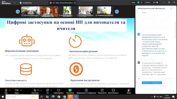 Особливу увагу вона приділила формуванню в учнів здатності орієнтуватися в інформаційному просторі, оперувати даними та використовувати цифрові технології й пристрої. Важливим акцентом стала безпечна та етична поведінка в онлайн-середовищі. Доповідачка також наголосила на потенціалі інтеграції основ кодування через ігрові платформи (Codeium, Codewars, LeetCode), 3D-моделювання (LumaAI, SplineAI, Kaedim, MeshyAI) та робототехніки, де інструменти штучного інтелекту (Gazebo, OpenAI Gym, TensorFlow, NVIDIA Isaac Sim тощо) допомагають дітям розвивати логіку й алгоритмічне мислення.